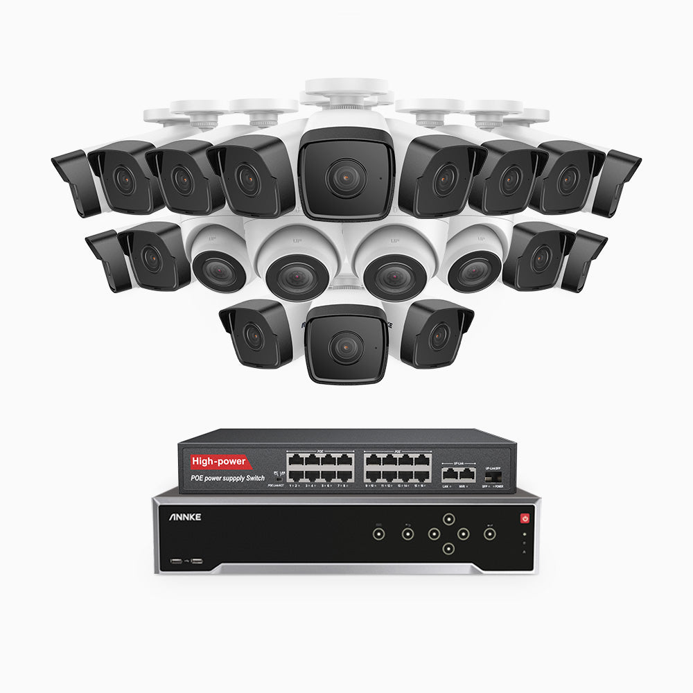H500 - 3K 32 Channel PoE Security System with 16 Bullet & 4 Turret Cameras, EXIR 2.0 Night Vision, Built-in Mic & SD Card Slot, Works with Alexa, 16-Port PoE Switch Included ,IP67 Waterproof, RTSP Supported