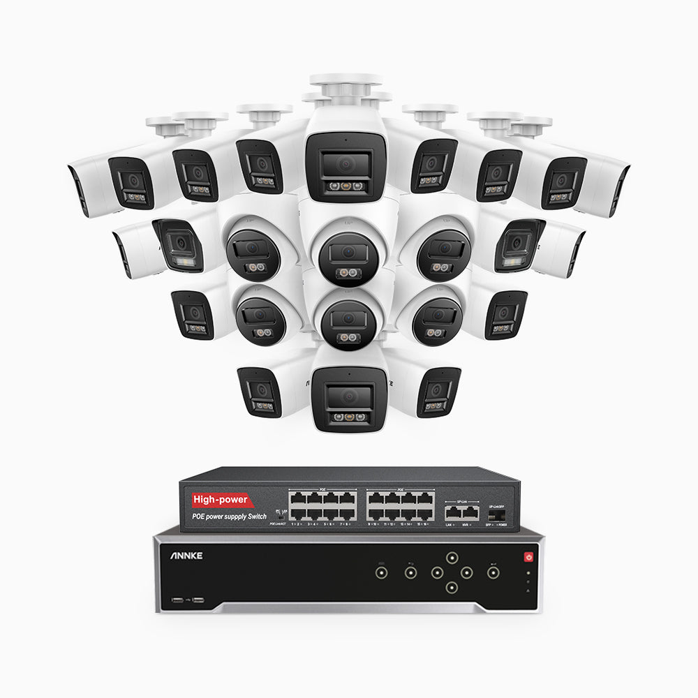 H800 - 4K 32 Channel PoE Security System with 18 Bullet & 6 Turret Cameras, Human & Vehicle Detection, Color & IR Night Vision, Built-in Mic, RTSP Supported, 16-Port PoE Switch Included