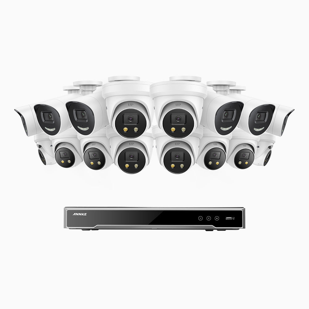 H800X - 4K 16 Channel PoE Security System with 6 Bullet & 10 Turret Cameras, 1/1.8'' BSI Sensor, f/1.6 Aperture (0.003 Lux), Siren & Strobe Alarm,Two-Way Audio, Human & Vehicle Detection, Perimeter Protection, Works with Alexa, All-Metal Housing