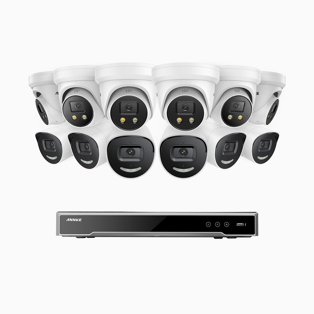 H800X - 4K 16 Channel PoE Security System with 6 Bullet & 6 Turret Cameras, 1/1.8'' BSI Sensor, f/1.6 Aperture (0.003 Lux), Siren & Strobe Alarm,Two-Way Audio, Human & Vehicle Detection, Perimeter Protection, Works with Alexa, All-Metal Housing