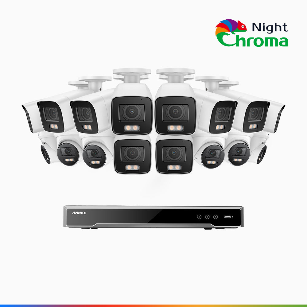 NightChromaTM NCK800 – 4K 16 Channel PoE Security System with 10 Bullet & 6 Turret Cameras, f/1.0 Super Aperture, Color Night Vision, 2CH 4K Decoding Capability, Human & Vehicle Detection, Intelligent Behavior Analysis, Built-in Mic, 124° FoV